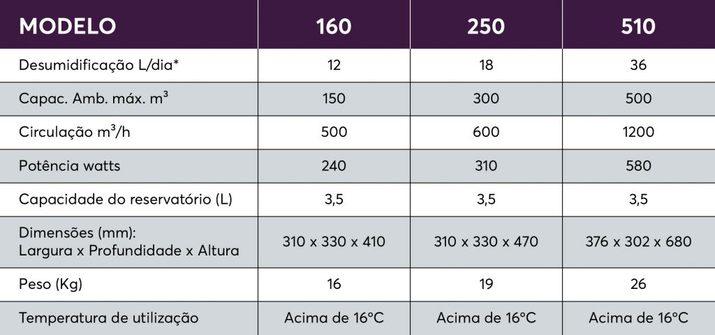 *Performance obtida a 80% UR e 30ºC. Para grandes espaços recomendamos a utilização de mais de um equipamento. Um equipamento não dimensionado para o ambiente, pode não alcançar o rendimento desejado.